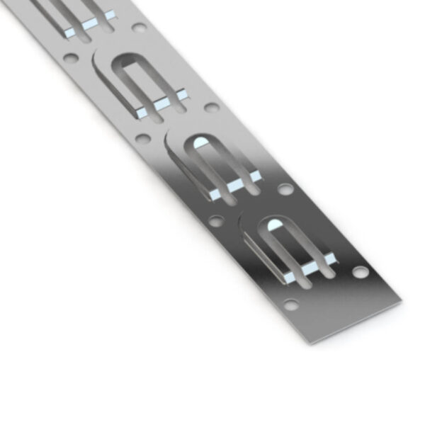 Traka je izrađena od pocinkovanog lima, što je čini otpornom na koroziju i pogodnom za ugradnju u cementnu košuljicu i druge građevinske materijale. Hvataljke za fiksiranje kabla su postavljene na svakih 2.5 cm (C-C), što omogućava lako postavljanje kablova na različitim razmacima. Najmanje preporučeno rastojanje je 7.5 cm (svaka treća hvataljka).