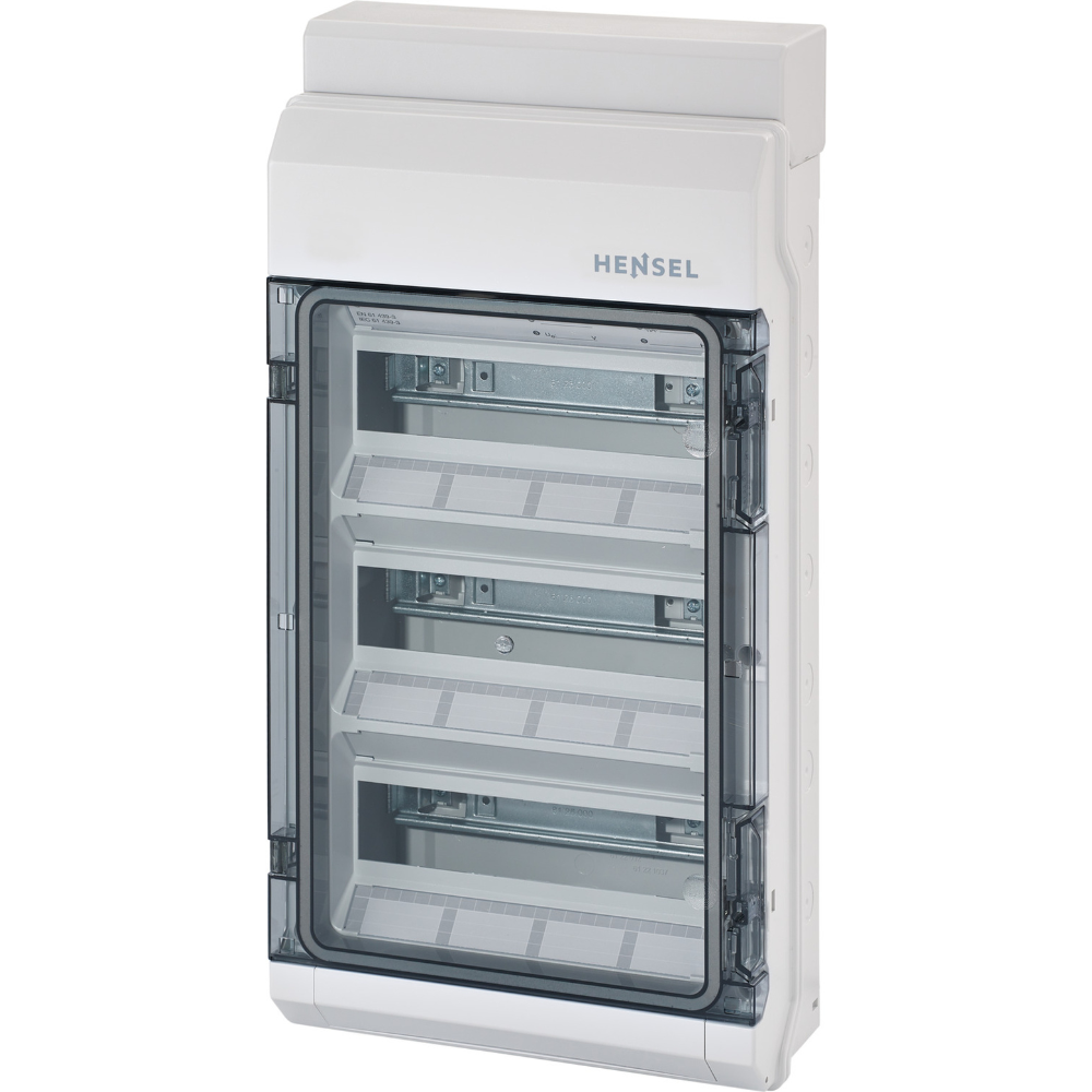 Hensel KV 3536 je nadgradni razvodni orman velikog kapaciteta, sa 36 modula raspoređenih u tri standardna reda (3×12). Ovo je najčešći izbor za glavne table u većim stanovima, kućama ili manjim poslovnim prostorima, jer nudi dovoljno mesta za sve osigurače, FID sklopke i dodatnu automatiku, a ne zauzima previše mesta na zidu (širina svega 295mm).
