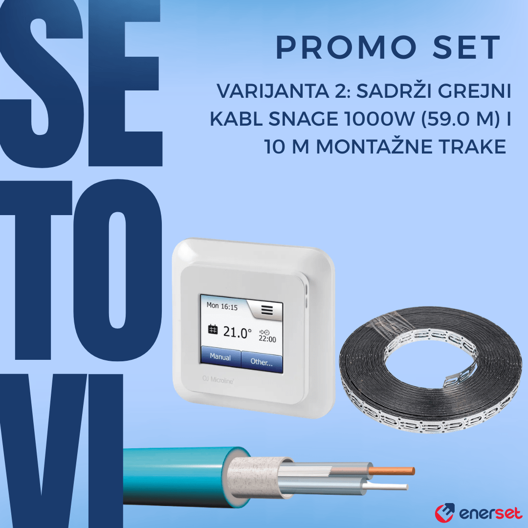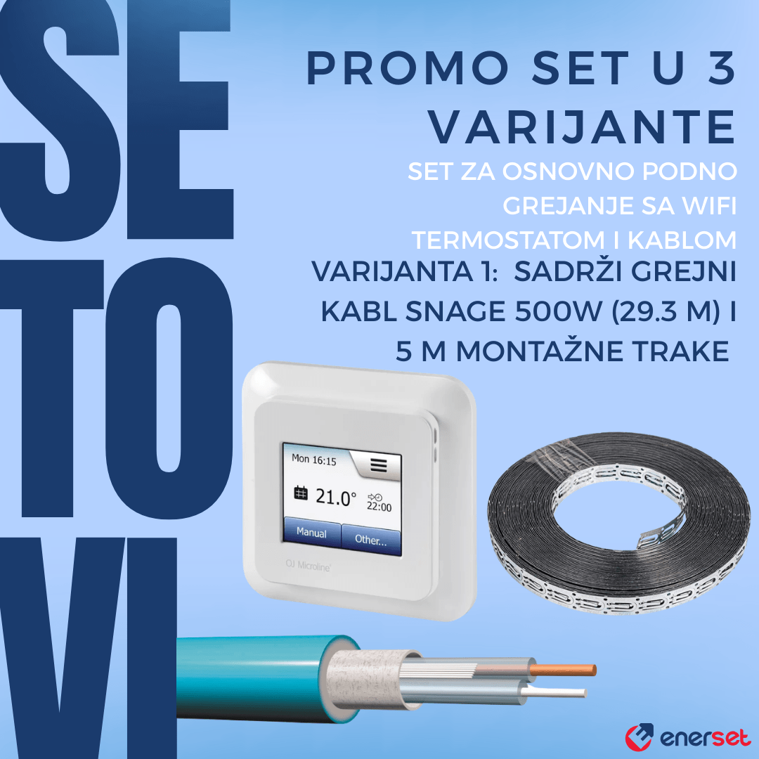 Ovaj set predstavlja premium rešenje za podno grejanje, projektovano da služi kao primarni (osnovni) sistem grejanja sa dodatkom pametne kontrole. Sadrži sve tri ključne komponente – napredni WiFi termostat, snažan grejni kabl velike izdržljivosti i montažnu traku za pravilno pozicioniranje. Idealan je za novogradnju i temeljne adaptacije, gde se traži pouzdano, dugoročno i pametno rešenje za grejanje celokupnog prostora.