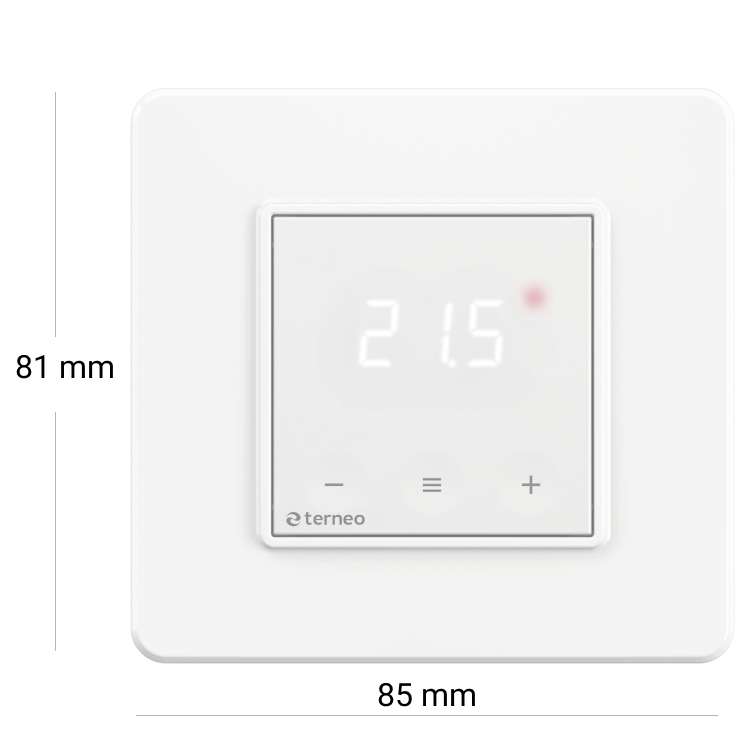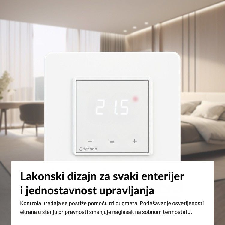 Termostat terneo S je dizajniran da održava konstantnu temperaturu od 5 do 40 °C u sistemima podnog grejanja zasnovanim na: električnom grejnom kablovima ili vodenom podnom grejanju pomoću normalno zatvorenog (NC) elektromagnetnog ventila sa radnim naponom od 230 V. Njegov digitalni ekran i elegantni tasteri na dodir omogućavaju laku navigaciju kroz meni i precizno podešavanje parametara, dok noćni režim smanjuje osvetljenost ekrana za dodatni komfor.