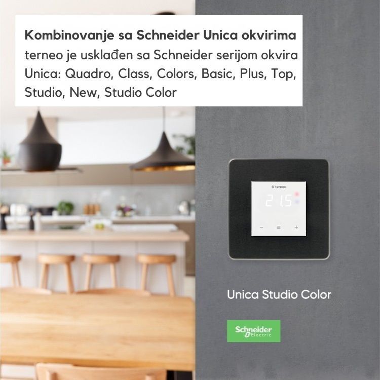 Digitalni termostat terneo S nudi mogućnost uklapanja u moderne enterijere. Isporučuje se sa standardnim okvirom u boji termostata. Njegova prirubnica omogućava prihvat okvira iz Schneider Unica linije proizvoda. Kupovinom okvira u boji vašeg zida ili ostalih elektro urađaja ovaj termostat se može jednostavno uklopiti u moderne enterijere. Takođe, dizajn termostata omogućava montažu u višestruke ugradne dozne, sa ostalom opremom, što može biti izuzetno korisna opcija kod rekonstrukcije stanova ili pojedinih prostorija (na primer kupatila).
