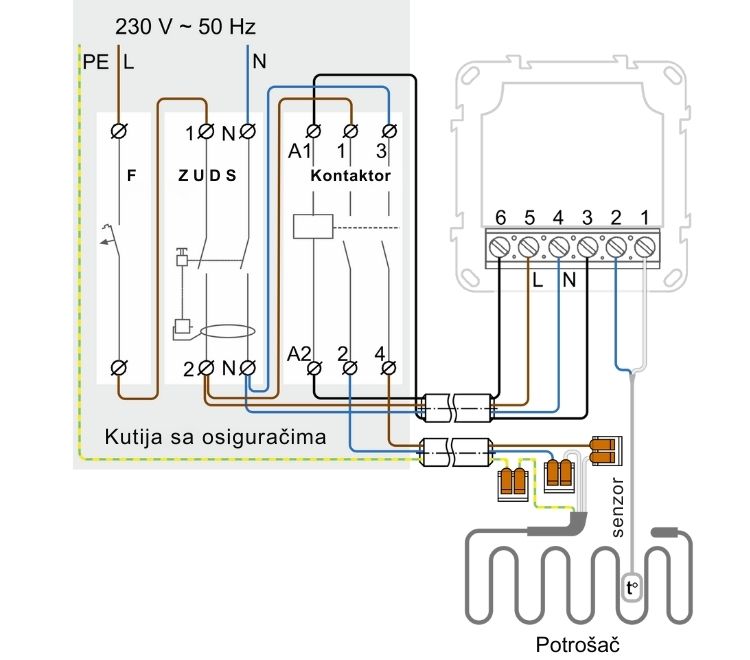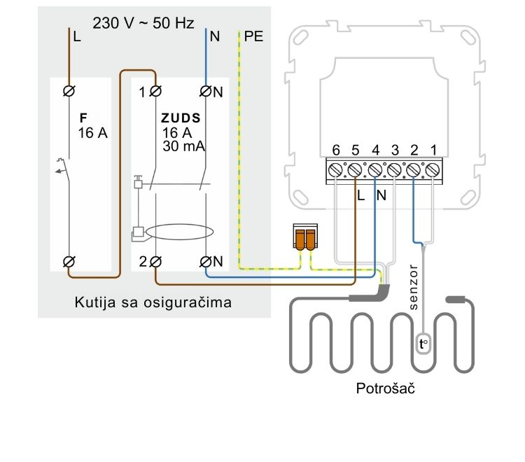 Da biste zaštitili od kratkih spojeva, instalirajte automatski osigurač (F) sa nominalnom strujom do 16 A u prekidu fazne žice pre termostata.