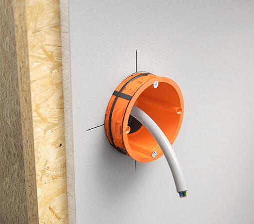 Ugradna dozna 9264‑12 postavlja se u otvor prečnika 68 mm, pripremljen u zidu ili panelu. Zahvaljujući steznim rebrima, kutija se sigurno fiksira u višeslojnim konstrukcijama od drveta, gips‑karton ploča ili OSB ploča, kao i u zidovima od izložene fasadne cigle. Kablovi i cevi se uvode kroz ulaze bez potrebe za dodatnim alatom, dok integrisano zadržavanje obezbeđuje da provodnici ostanu stabilni tokom i nakon instalacije. Uređaji se pričvršćuju pomoću četiri kupole i dva uređajna vijka, a obimne zaptivne lamele na dva nivoa garantuju vazdušnu nepropusnost i energetsku efikasnost.