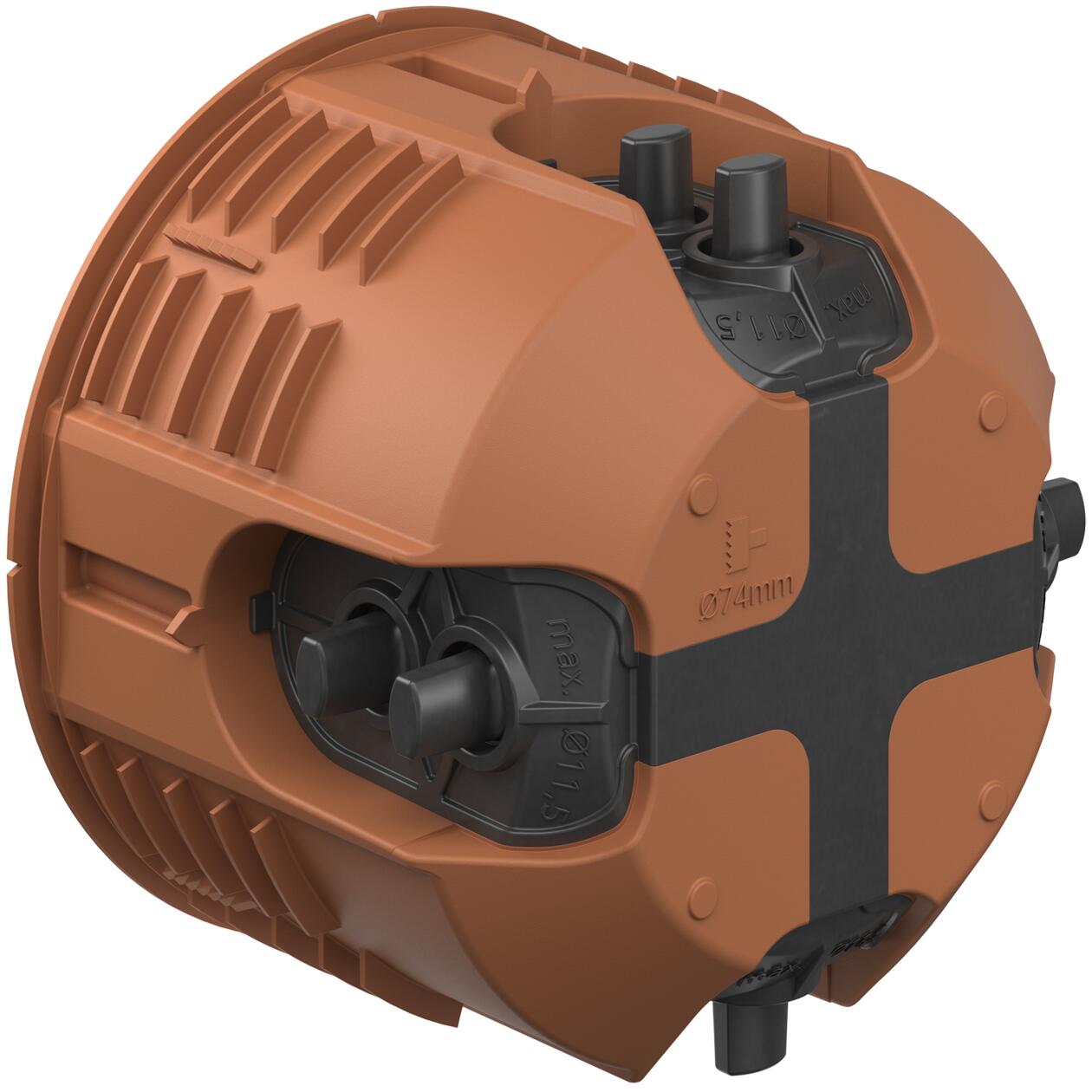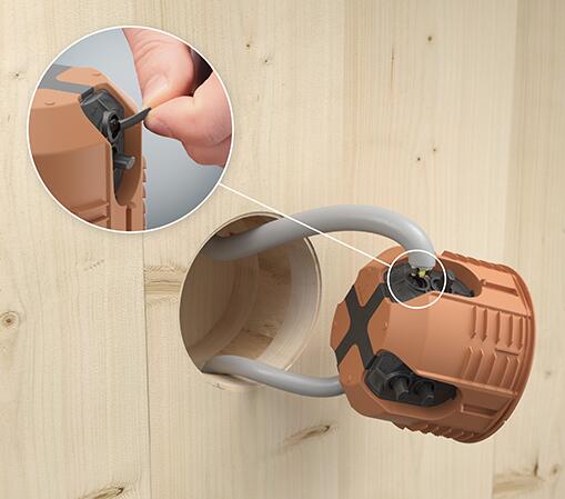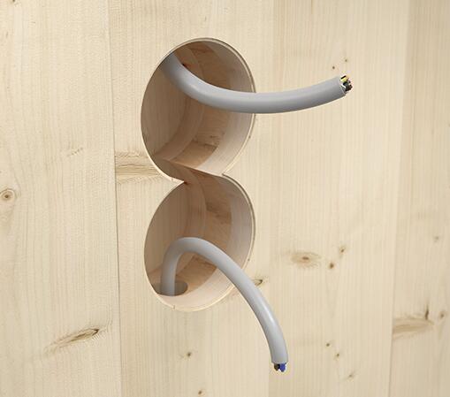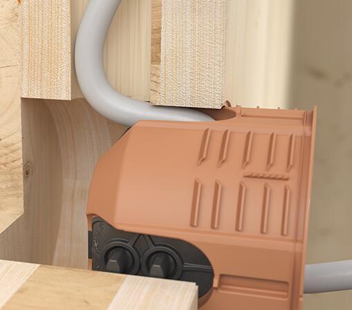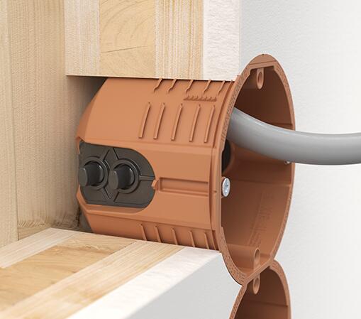 Ugradna dozna za puno drvo 9274-22 sa elastičnim uvodnicama omogućavaju jednostavno provlačenje kablova do Ø 11,5 mm bez upotrebe alata. Idealno za brzu montažu i precizno pozicioniranje. Najnoviji dizajn uvodnica kompenzuje odstupanja tunela za kabl od ulaza u doznu, kod bušenja u drvetu, obezbeđujući optimalnu vezu između kabla i kutije – bez gubitka zaptivenosti. Za višestruke kombinacije i izradu višestrukih dozni sa međuosnim rastojanjem od 71 mm, rubna ivica se jednostavno uklanja pomoću sečiva, omogućavajući jednostavno povezivanje. Ugradna dozna za puno drvo se utiskuje u otvor Ø 74 mm u zidu od punog drveta uz pomoć specijalnog alata za postavljanje 1090-12, što garantuje stabilnost i preciznost.