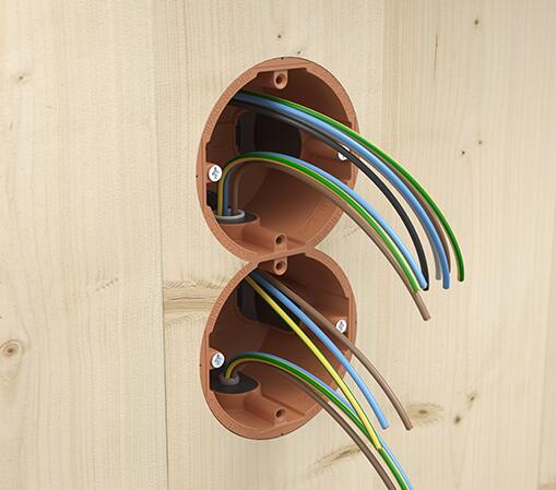 Nova jednostruka dozna za puno drvo 9274-22 idealna je za elektroinstalacije u objektima sa masivnim drvenim konstrukcijama – kao što su montažne kuće, drvene vikendice, CLT paneli i energetski efikasne zgrade. Ugradna dozna poseduje 8 fleksibilnih ulaza za kablove koji se otvaraju bez alata, što ubrzava instalaciju i omogućava precizno vođenje kablova. Mogućnost izrade kombinacija sa razmakom od 71 mm čini je idealnom za kompleksnije instalacije. Uz podršku za prolazno ožičenje i kompatibilnost sa standardnim uređajima, dozna za puno drvo 9274-22 je pouzdan izbor za moderne drvene konstrukcije.