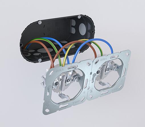 Standardizovana montaža: Rastojanje između otvora od 71 mm omogućava ugradnju dva uređaja (prekidača, utičnica) u skladu sa DIN 49073, bez dodatnog nivelisanja.
