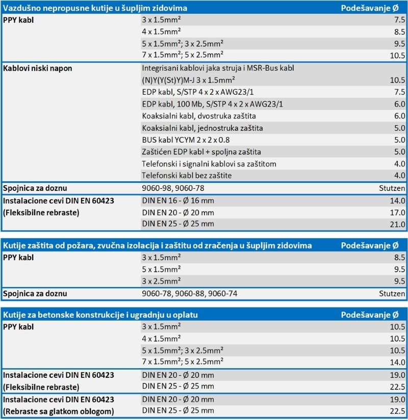 Tabela odabira prečnika pomaže instalaterima da izaberu tačan prečnik u zavisnosti od tipa instalacije, kako bi se obezbedio tačan otvor i očuvala nepropusnost, zvučnu izolacija i protivpožarne karakteristike ugradne kutije.