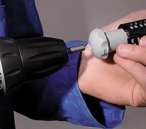 Kod ugradnih kutija izrađenih od tvrde plastike ili kod modela sa debljim zidovima preporučuje se upotreba aku bušilice kako bi se obezbedila dovoljna snaga i stabilnost tokom otvaranja kutije. Otvarač rupa 1085‑80 potrebno je postaviti u standardni 1/4″ prihvat aku bušilice. Alat se kreće ravnomerno, a bušilica radi u kontrolisanom režimu kako bi se izbeglo pucanje plastike ili deformacija kutije. Kada se otvor formira, alat se izvlači pravolinijski, bez uvrtanja, kako bi ivice ostale glatke i pravilne.