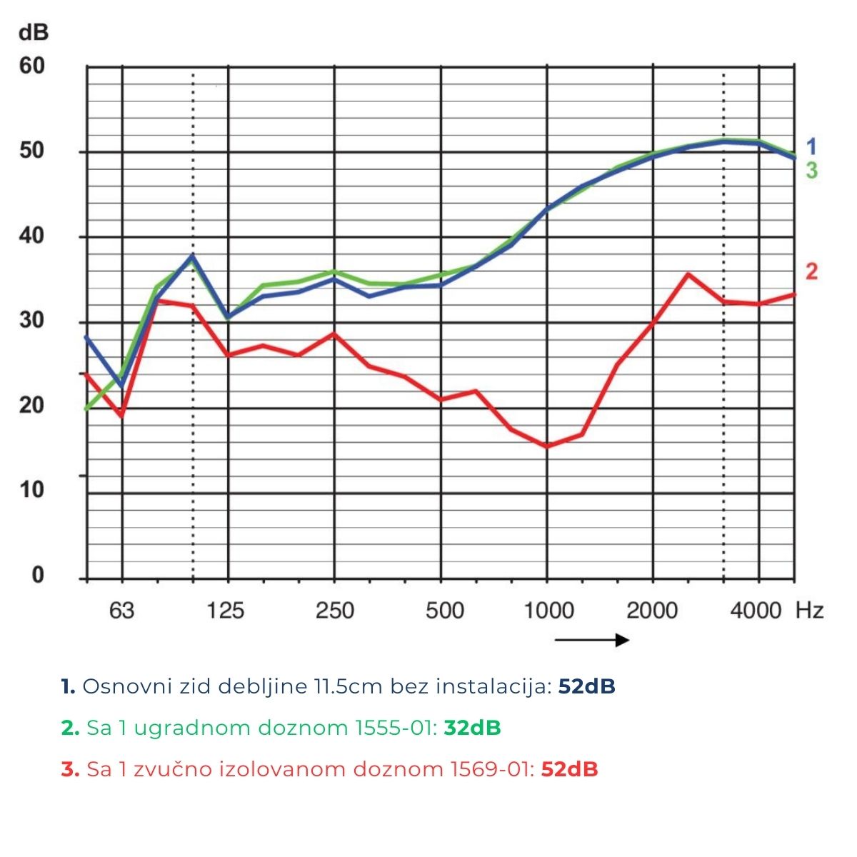 Testiranja sprovedena na različitim debljinama pregradnih zidova ne dvosmisleno pokazuju superiornost zvučno izolovanih ugradnih dozni. Čak i kod najzahtevnijih zidova sa zvučnom izolacijom od 56 dB, ugradnja jedne ili čak pet dozni 1569-01 u nizu ne dovodi do apsolutno nikakvog pada u zvučnoj izolaciji zida. U poređenju sa standardnim doznama, koje mogu smanjiti zvučnu izolaciju zida za 30 dB i više (kod višestrukih dozni), zvučno izolovane dozne garantuju očuvanje mira i tišine.