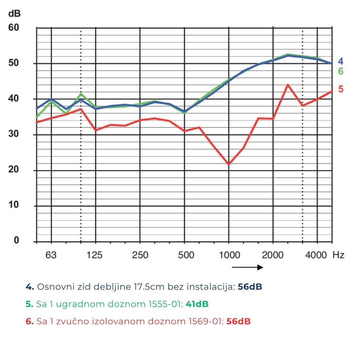 Pregradni puni zid debljine 17.5 cm (obostrano malterisan sa 10mm maltera) ugrađene zvučno izolovane dozne. Grafikon 2 prikazuje zvučnu izolaciju osnovnog zida i promene nakon ugradnje zvučno izolovane dozne.